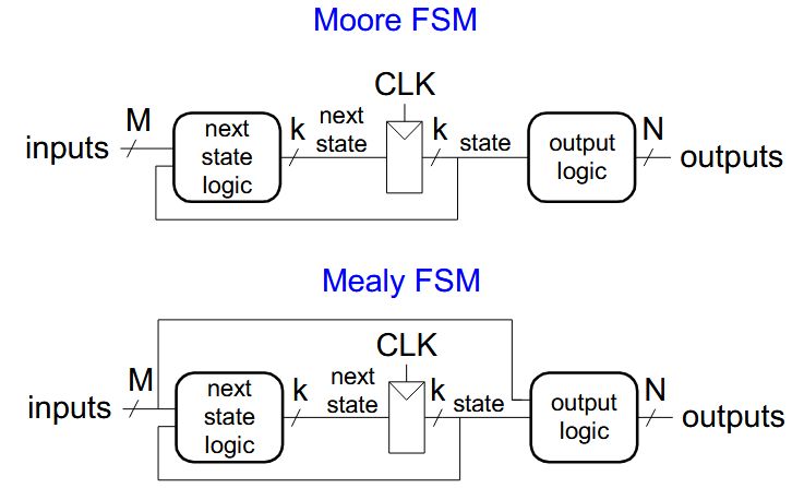 Two types of finite state machines differ in the output logic:<br><ol><li>{{c1::Moore FSM}}: outputs depend only on the current state</li><li>{{c1::Mealy FSM}}: outputs depend on the current state and the inputs</li></ol> |