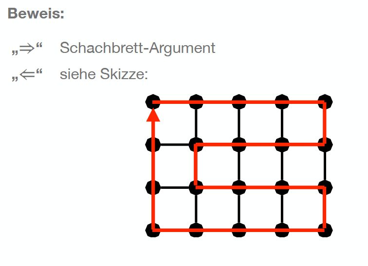 Seien \(m,n \geq 2\). <br><br>Ein \(n \times m\) Gitter enthält {{c2::einen Hamiltonkreis}} genau dann, wenn {{c1::\(n \cdot m\) gerade ist}}. |