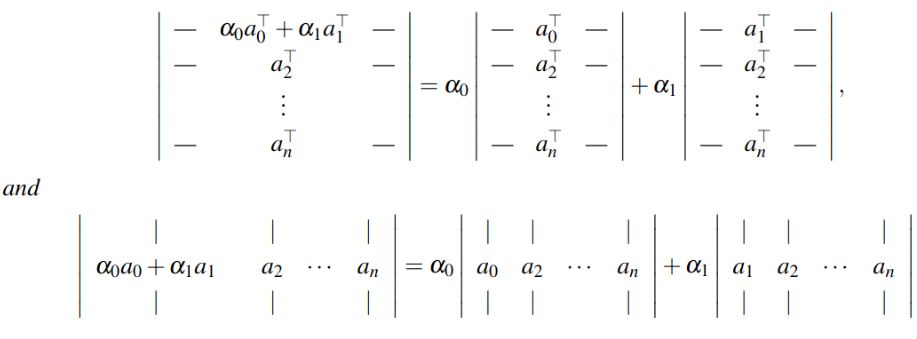 The determinant is linear in each row (or each column). In other words for any \(a_0, a_1, a_2, \dots, a_n \in \mathbb{R}^n\) and \(\alpha_0, \alpha_1 \in \mathbb{R}\) we have: (Two linearity properties)