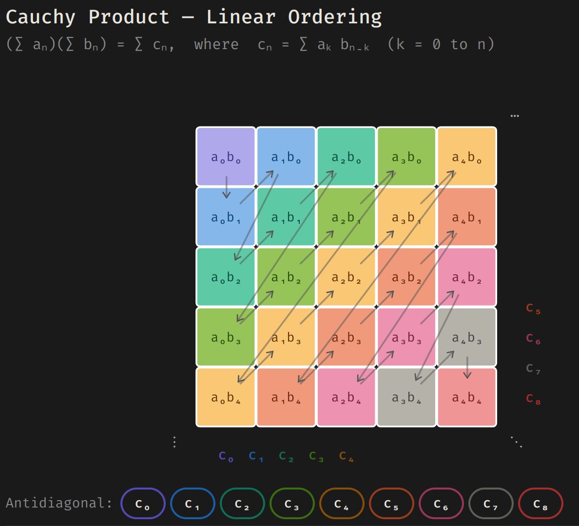\[c_n = {{c1::\sum_{j=0}^n a_{n-j} b_j}} = a_n b_0 + a_{n-1}b_1 + \cdots + a_0 b_n\]