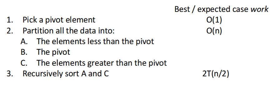 | Back | This is just two packs! <ul> <li>We know a pack is \(O(n)\) work, \(O(\log n)\) span</li> <li>Pack elements less than pivot into left side of <code>aux</code> array</li> <li>Pack elements greater than pivot into right side of <code>aux</code> array</li> <li>Put pivot between them and recursively sort</li> <li>With a little more cleverness, can do both packs at once but no effect on asymptotic complexity</li> </ul> With \(O(\log n)\) span for partition, the total span for quicksort is \(T(n) = O(\log n) + 1T(n/2) = O(\log^2 n)\).<br> Parallelism is \(O(n \log n) / O(\log^2 n) = O(n / \log n)\). |