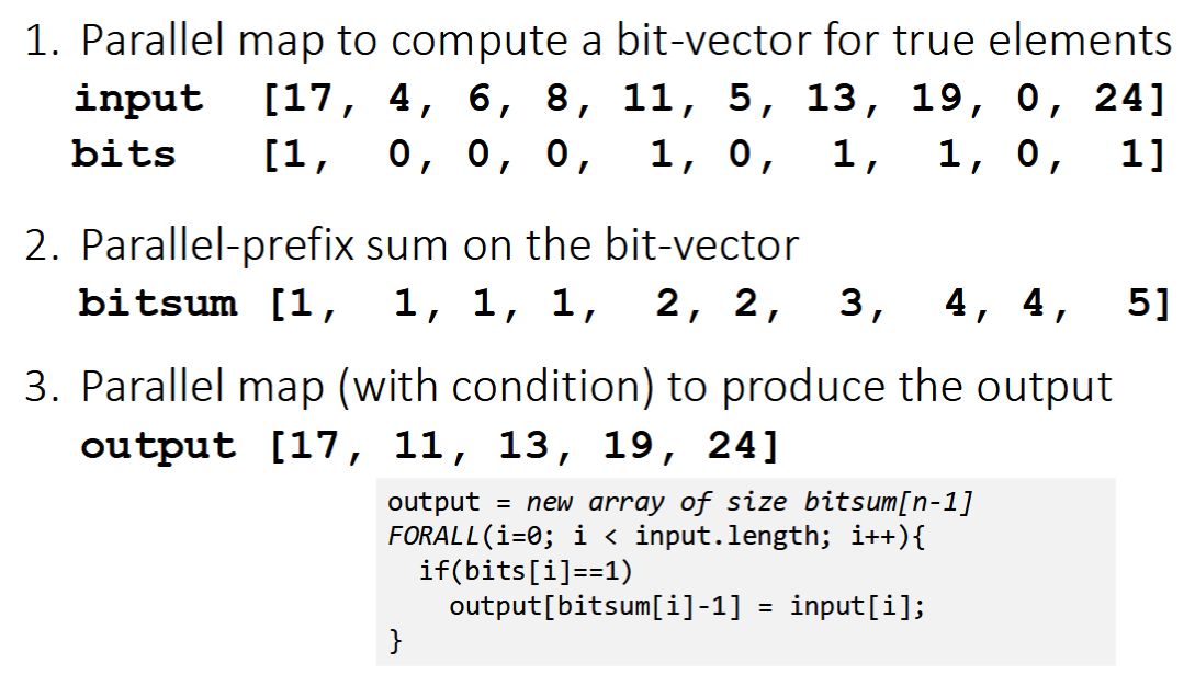 | Back Extra | First two steps can be combined into one pass <ul> <li>Just using a different base case for the prefix sum</li> <li>No effect on asymptotic complexity</li> </ul> Can also combine third step into the down pass of the prefix sum <ul> <li>Again no effect on asymptotic complexity</li> </ul> Analysis: \(O(n)\) work, \(O(\log n)\) span <ul> <li>2 or 3 passes, but 3 is a constant</li> </ul> |