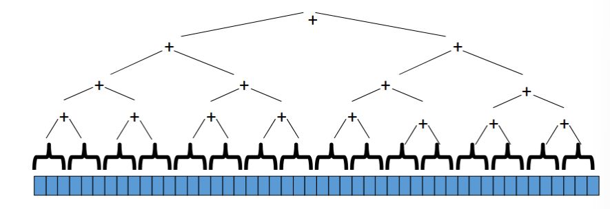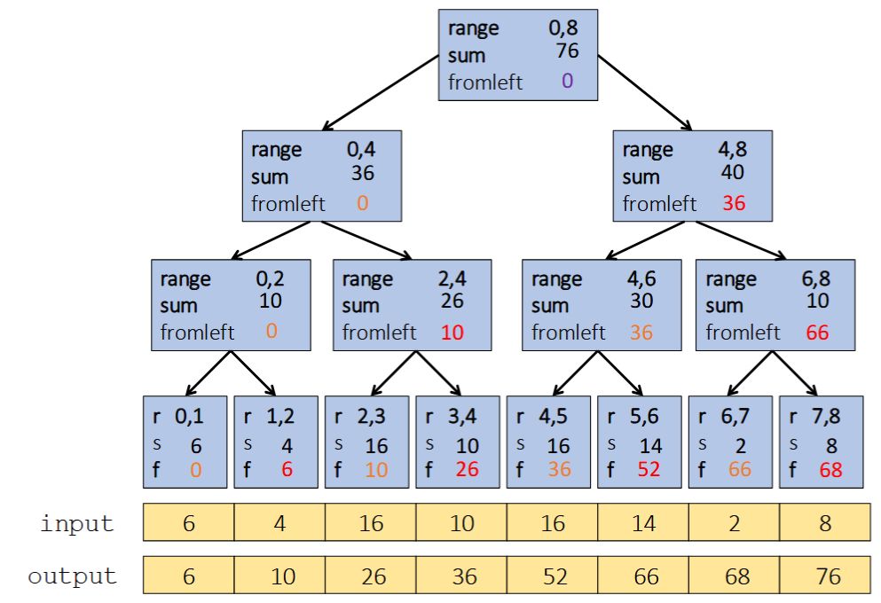 | Text | <b>Parallel prefix-sum</b> <br><br> The parallel-prefix algorithm does two passes:<br><ol><li> First pass {{c1::builds a tree bottom-up: the "up" pass}}</li><li> Second pass {{c1::traverses the tree top-down: the "down" pass}}</li></ol> | |