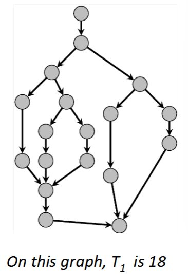 | Extra | <img src="paste-ec818a1d799c2a19ea6cad709291b848ccaa132c.jpg" style="float: right;">On this graph: \(T_1 / T_\infty = 18 / 9 = 2\) <br><br> This means that even with infinite cores and threads, the best possible speedup is 2.<br><br> Bottleneck is the span – DAG structure does not allow more parallelism. |