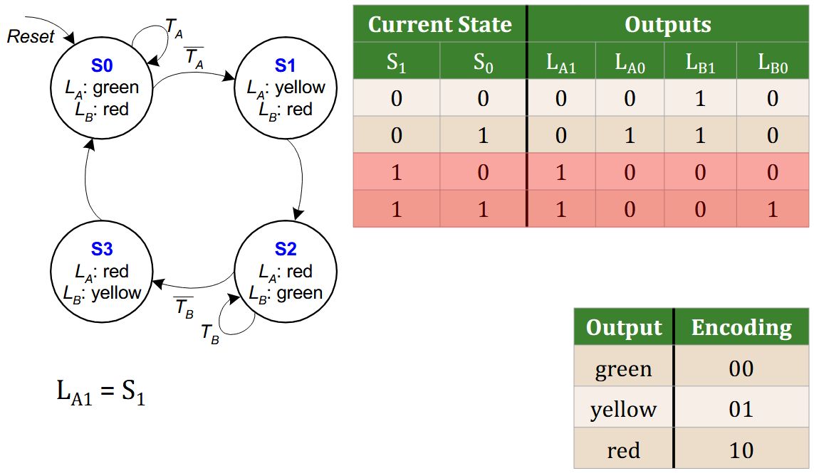 - Mealy FSM: outputs depend on the current state and the inputs