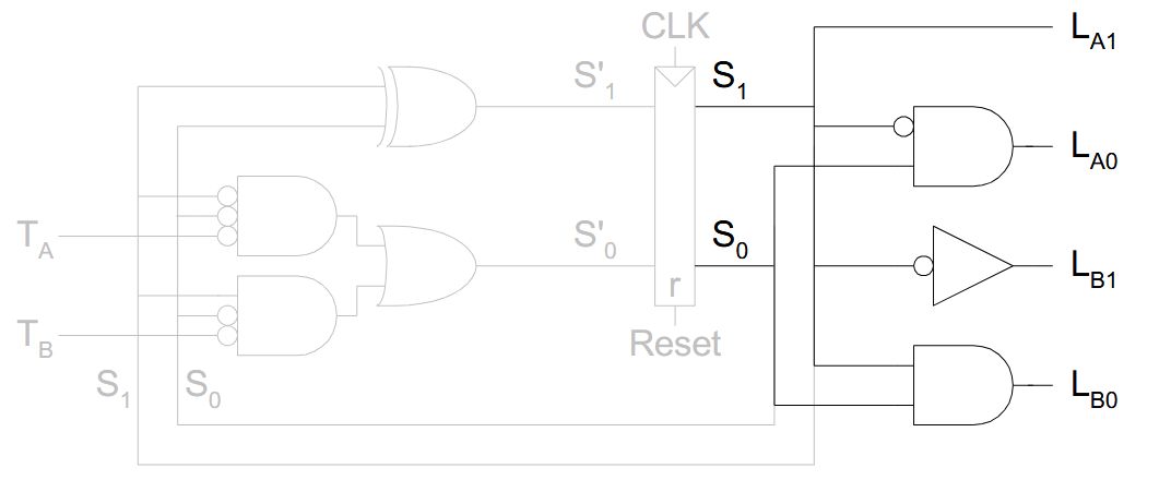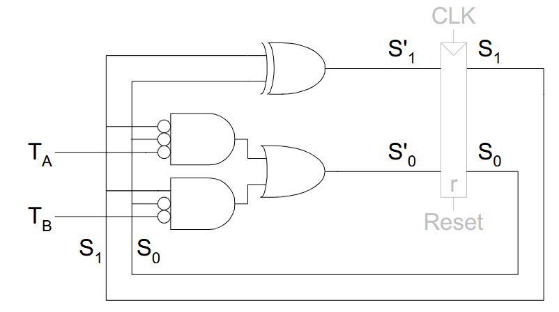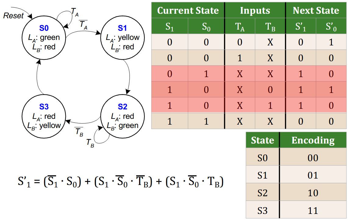 | Extra | <em>Example states:</em> 001, 010, 100, 110<br><ul><li>Bit₀ encodes <strong>green</strong> light output</li><li>Bit₁ encodes <strong>yellow</strong> light output</li><li>Bit₂ encodes <strong>red</strong> light output</li></ul> |