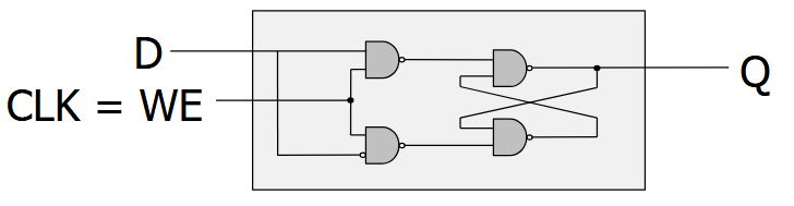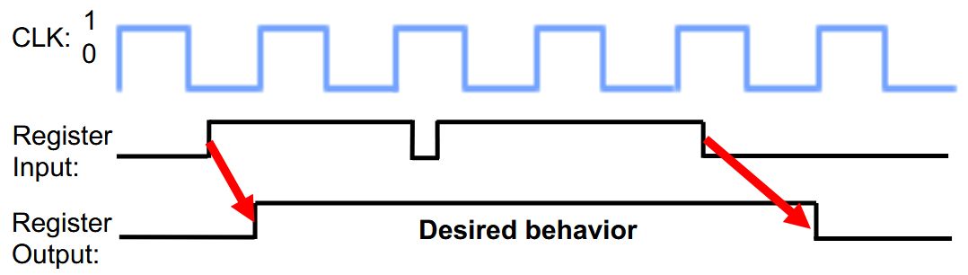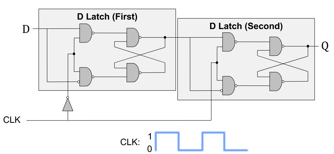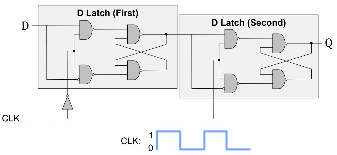 | Back | We use a D Flip-Flop<br><img src="paste-cc73c8e859236da274b023d8fb58b5b1d90451f3.jpg"><br><br>When the clock is low, 1st latch propagates D to the input of the 2nd (Q unchanged).<br><br>Only when the clock is high, 2nd latch latches D (Q stores D).<br>At the rising edge of clock (clock going from 0\(\rightarrow\)1), Q gets assigned D. |