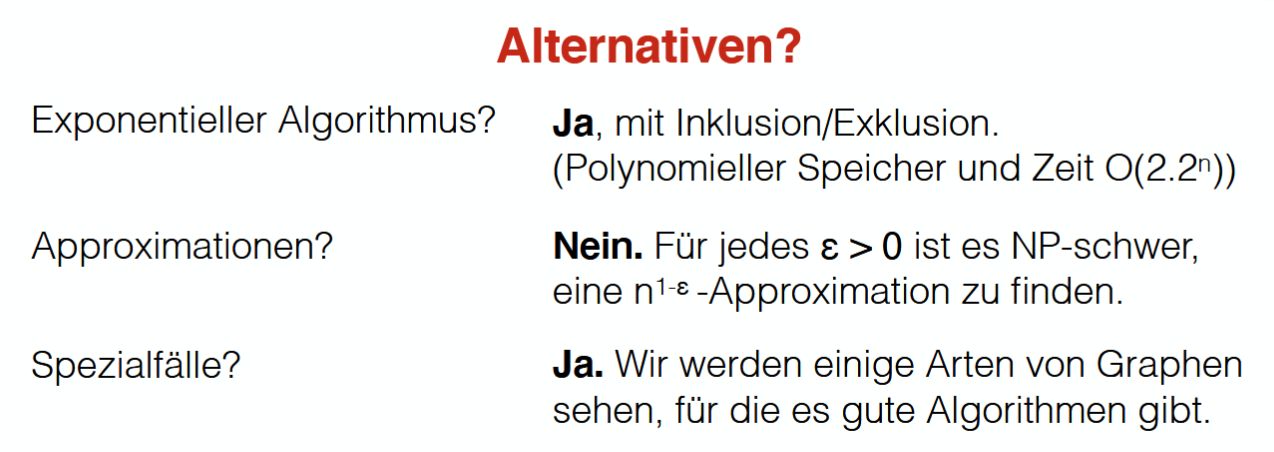 | Text | <img src="paste-abfd33d5257708cb778d485196521618b5c07e9e.jpg"><br><br>Es gibt bipartite Graphen und eine Reihenfolge \(V = \{v_1, \ldots, v_n\}\) der Knoten, für die der Greedy-Algorithmus \({{c1::|V|/2}}\) viele Farben benötigt. | |