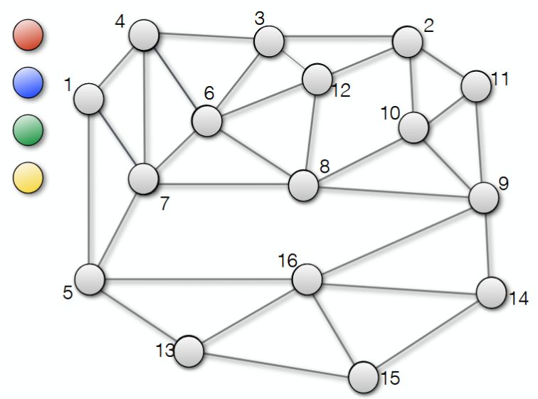 | Extra | Heuristik:<br>\(v_n\) := Knoten vom kleinsten Grad. Lösche \(v_n\).<br>\(v_{n-1}\) := Knoten vom kleinsten Grad im Restgraph. Lösche \(v_{n-1}\). Iteriere.<br><br>Falls \(G=(V,E)\) erfüllt:<br>In jedem Subgraphen gibt es einen Knoten mit Grad \(\leq k\)<br>\(\Rightarrow\) Heuristik liefert Reihenfolge \(v_1,\ldots,v_n\) für die der Greedy-Algorithmus höchstens \(k+1\) Farben benötigt |