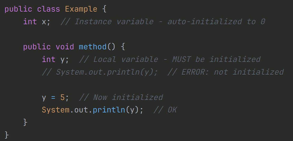 | Extra | This is only true for <b>local</b> variables! Instance variables can be left uninitialised.<br><br><img src="paste-a119684222f3e74cbbcfa0830461d164b54afb9a.jpg"> |